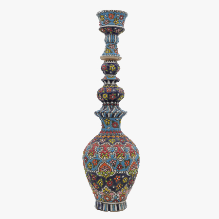 قلیان میناکاری شده ایز کوچیک از جنس سفال، ترکیبی زیبا از هنر و کاربرد است. این قلیان‌ها با دقت و ظرافت خاصی توسط هنرمندان ماهر میناکاری شده‌اند، به طوری که هر کدام از آن‌ها یک اثر هنری منحصر به فرد به شمار می‌روند. طراحی‌های پیچیده و رنگ‌های زنده‌ای که در میناکاری به کار رفته، نه تنها جلوه‌ای شگفت‌انگیز به این وسیله می‌بخشند، بلکه آن را به یک آیتم دکوری شیک و جذاب تبدیل می‌کنند که می‌توان از آن هم در مراسمات خاص استفاده کرد و هم در فضای داخلی خانه به عنوان یک تزیین هنری قرار داد. این قلیان‌های سفالی نه تنها از نظر ظاهری فوق‌العاده‌اند، بلکه به دلیل ساختار مقاوم و کیفیت بالای مواد استفاده شده، برای استفاده عملی نیز بسیار مناسب و کارآمد هستند.